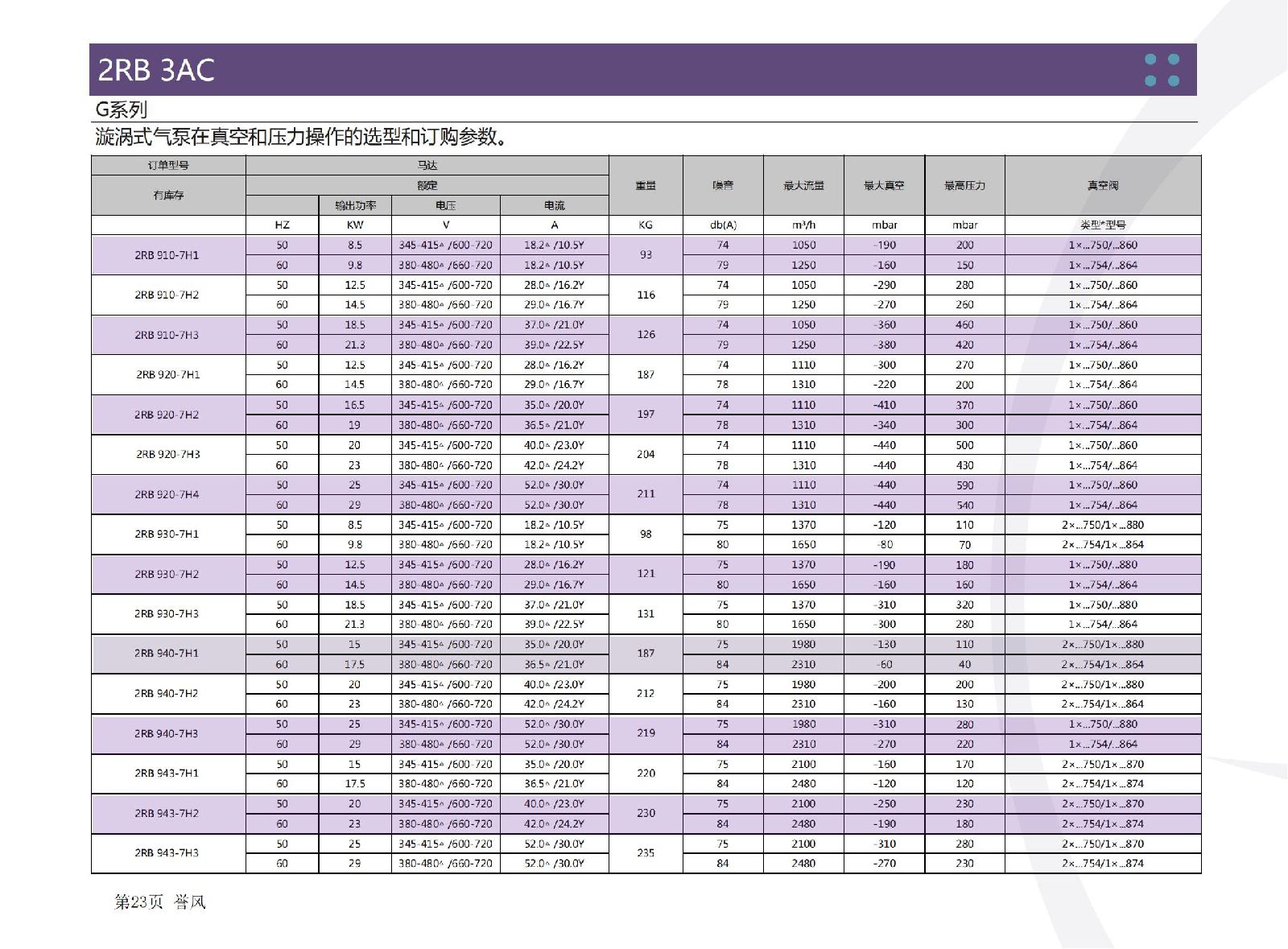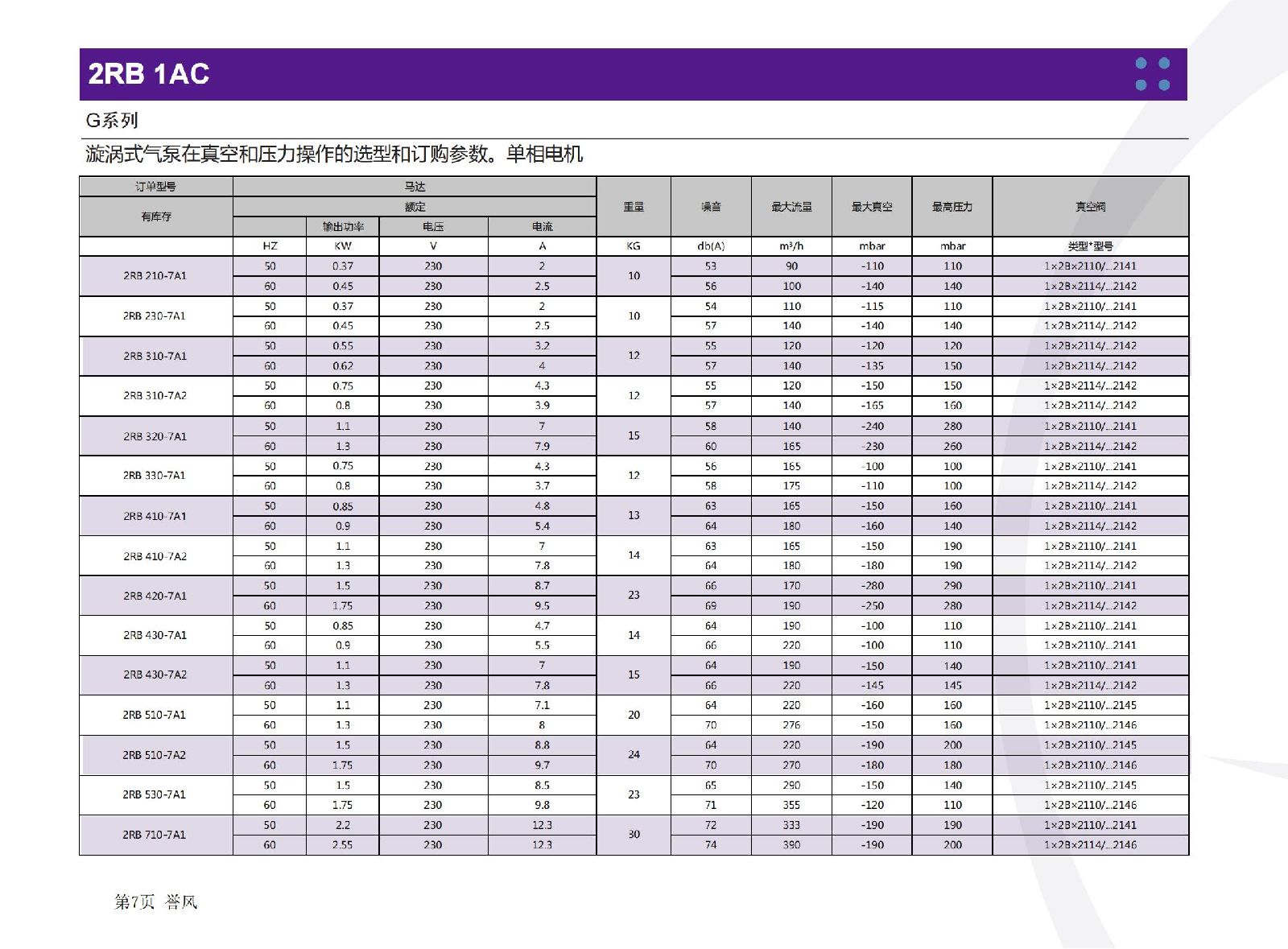 同系列的 2RB 410 - 7H2 型号在 50Hz 频率下*大负压可达 - 170mbar,正压参数与之接近;而 2RB 410 - 7H3 压力为 160mbar,推测 2RB 410 - 7H2 的 170mbar 压力是针对除油除水场景的定制化调校,能满足油污、水分分离所需的气压推力 |
